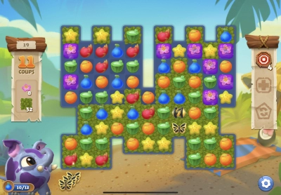 Un jeu de match 3 est un type de jeu de puzzle populaire dans lequel le joueur doit faire correspondre au moins trois éléments identiques pour les faire disparaître de l'écran. Les éléments (des fruits et des fleurs) sont disposés dans des grilles différentes dans chaque niveau., Dans Wild Things : Animal Adventures faut intervertir des éléments adjacents pour créer des alignements de trois éléments ou plus.